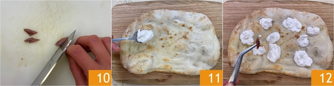 Enfin, coupez les anchois à l'huile en losanges 10. Sortez la base de la pinsa du four et garnissez-la de petites cuillerées de crème au fromage 11, puis ajoutez les morceaux d'anchois 12.