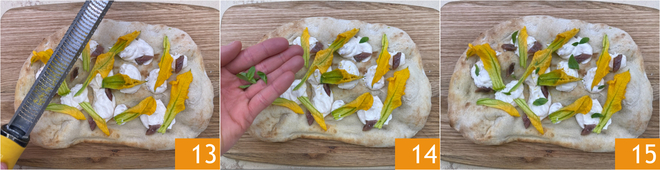 Disposez les fleurs de courgette sur la surface et parfumez avec le zeste de citron râpé 13 et quelques petites feuilles d'origan frais 14. Votre pinsa aux fleurs de courgette, anchois et crème au fromage est prête à être servie 15 !