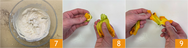 Vous devez obtenir une crème douce et homogène 7. Faites cuire la base de la pinsa dans un four ventilé préchauffé à 250° pendant 5 minutes. Entre-temps, retirez le pistil des fleurs de courgette 8 et coupez-les en fines lanières 9.