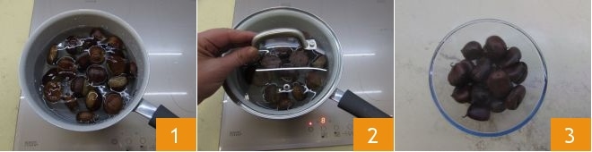 Pour préparer la pintade farcie aux châtaignes avec sauce à la grenade, commencez par faire bouillir les châtaignes. Versez-les dans une casserole pleine d'eau 1, couvrez-les avec un couvercle 2 et laissez-les cuire pendant environ 30 minutes. Une fois ce temps écoulé, faites le test du cure-dent : piquez-les pour vérifier qu'elles soient cuites et, le cas échéant, égouttez-les. Mettez-les de côté dans un bol 3, couvrez-les et laissez-les tiédir ; de cette façon, l'enveloppe extérieure s'assouplira et il sera plus facile de les éplucher.