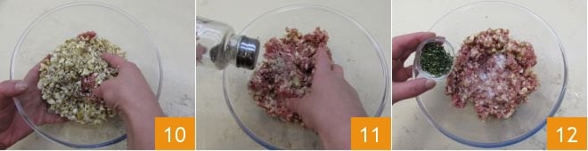 Pétrissez le tout avec les mains 10 et assaisonnez de sel et de poivre 11. Hachez finement le romarin et incorporez-le à la pâte 12.