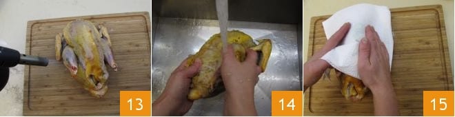 Mettez la farce de côté pendant quelques minutes et occupez-vous de la pintade. Flambez la pintade pour éliminer les éventuelles plumes ou duvet 13, nous avons utilisé un chalumeau mais, à défaut, vous pouvez approcher la pintade pendant quelques secondes de la flamme du gaz. Ensuite, rincez-la sous l'eau courante 14 et essuyez-la avec du papier absorbant 15.