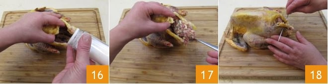 Salez et poivrez l'intérieur de la pintade 16 puis, à l'aide d'une cuillère, farcissez-la avec le mélange de saucisse et châtaignes 17. Cousez l'ouverture externe 18, en utilisant une aiguille de cuisine ou l'aiguille la plus grosse que vous avez et de la ficelle. De cette manière, vous la scellerez complètement et éviterez la fuite de la farce pendant la cuisson.