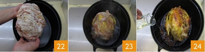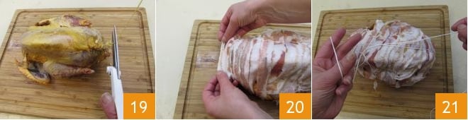 Ensuite, coupez la partie finale de la ficelle 19 et bardez la pintade avec la pancetta 20. Enfin, enroulez le tout avec de la ficelle 21, comme pour un rôti afin de fixer la pancetta.