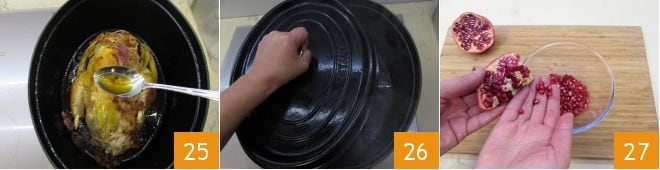 et poursuivez la cuisson pendant 90 minutes supplémentaires en l'arrosant de temps en temps avec son jus 25 et en couvrant le tout avec un couvercle 26. Lorsque la pintade est presque cuite, préparez la sauce d'accompagnement. Coupez la grenade en deux et commencez à la dénoyauter 27, en réservant les grains.