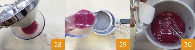 Obtenez 280 g et transférez-les dans un moulin à légumes pour en extraire uniquement le jus 28, puis versez-le dans une casserole en le filtrant 29 et ajoutez le sucre 30. Mélangez le tout et faites cuire pendant 5 à 6 minutes.