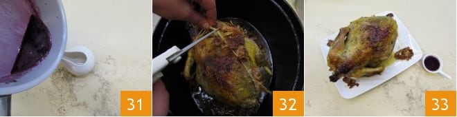Une fois que vous avez obtenu une sauce plutôt épaisse, versez-la dans une saucière 31 et reprenez la pintade désormais cuite. Retirez la ficelle extérieure en la coupant avec des ciseaux 32 et servez votre pintade farcie aux châtaignes encore chaude, accompagnée de la sauce à la grenade 33.