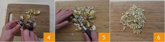 Une fois refroidies, épluchez les châtaignes 4, vous devrez obtenir 400 g de châtaignes nettoyées, puis hachez-les 5 grossièrement 6.