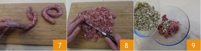 À ce stade, prenez la saucisse et retirez-la de son boyau externe 7, pour cela il suffit de faire une incision au centre de chaque saucisse et de le retirer délicatement avec les mains. Hachez également celle-ci grossièrement 8 et transférez-la dans un bol avec les châtaignes 9.