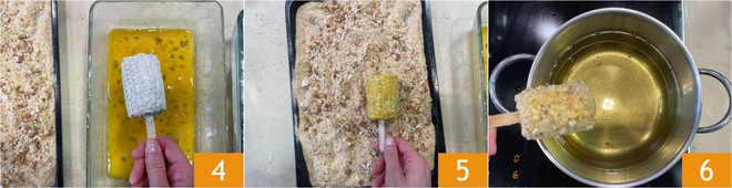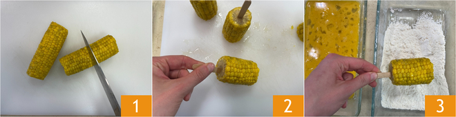Pour préparer les épis de maïs frits, commencez par les épis. Nous avons utilisé ceux déjà cuits, il suffira de les couper en deux 1 puis de les percer au centre avec un bâtonnet 2, comme ceux pour les glaces. Aidez-vous d'un maillet de cuisine pour cette opération car la partie centrale des épis est assez dure. Passez ensuite à la panure : passez-les d'abord dans la farine 3.