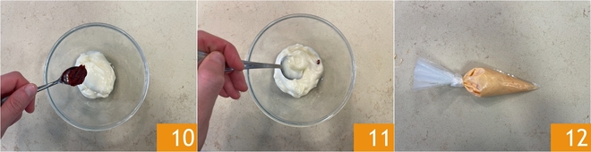 Pendant que vous faites frire les épis, vous pouvez vous consacrer à la sauce au piment : versez la mayonnaise dans un bol et ajoutez la pâte de piment 10. Mélangez et transférez dans une poche à douille 12.