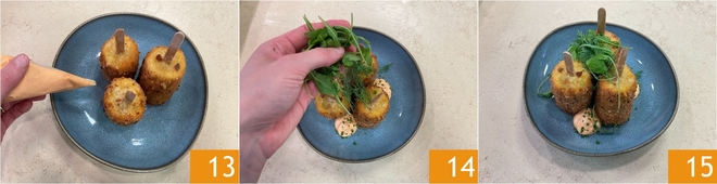 Pour dresser, disposez les épis avec le bâtonnet vers le haut, pressez des petits tas de mayonnaise au piment 13 et garnissez avec la roquette 14, l'aneth et la ciboulette. Voilà vos épis frits prêts, dégustez-les immédiatement 15 !