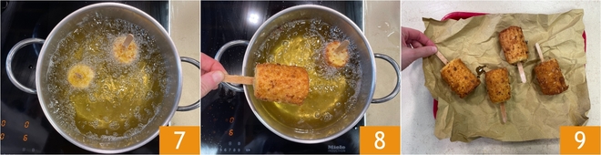Assurez-vous qu'ils soient bien immergés dans l'huile 7 et, lorsqu'ils seront bien dorés 8, égouttez-les sur un plateau recouvert de papier absorbant pour friture 9. Salez à votre convenance.