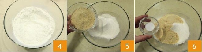 Maintenant, occupez-vous de la pâte des pisarei : tamisez la farine dans un bol 4, puis ajoutez la chapelure 5 et le sel 6.