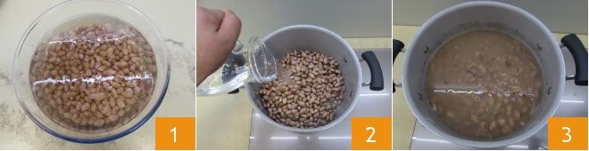 Pour préparer les pisarei e fasò, commencez par les haricots borlotti, placez-les dans un grand bol rempli d'eau et laissez-les tremper pendant 12 heures ou une nuit, couverts de film plastique 1. Une fois le temps de trempage écoulé, égouttez-les et rincez-les sous l'eau courante, puis mettez-les dans une casserole, couvrez-les d'eau 2 et cuisez pendant 30 minutes 3; ce temps sera suffisant car la cuisson des haricots se poursuivra ensuite avec la sauce.
