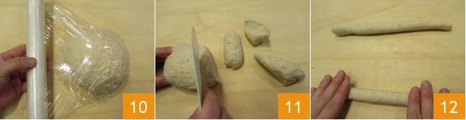 et enveloppez-la dans le film plastique 10. Laissez reposer la pâte dans un endroit frais pendant 1 heure (à l'extérieur du frigo, cela ira). Une fois le temps de repos écoulé, reprenez la pâte, divisez-la en petites portions 11, de celles-ci créez des boudins d'environ 1 cm de diamètre 12.