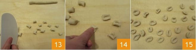 Coupez les boudins de pâte en petits morceaux de la taille d'un haricot 13. Avec le pouce, appuyez sur chaque gnocchi pour créer une cavité à l'intérieur 14. Les pisarei sont prêts 15; vous pouvez les répartir sur un plateau recouvert d'un torchon propre et sec, légèrement fariné. Il n'est pas nécessaire de les couvrir, même s'ils sèchent un peu, ce ne sera pas un problème.