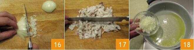 Maintenant, occupez-vous de la sauce : épluchez et hachez finement l'oignon 16, hachez également le lard 17. Puis dans une casserole, faites fondre le beurre à feu doux et faites revenir l'oignon 18,