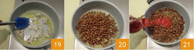 puis ajoutez le lard haché 19, mélangez pour parfumer et quand l'oignon sera fané, ajoutez aussi les haricots cuits précédemment et bien égouttés 20, couvrez-les de coulis de tomate 21 et poursuivez la cuisson de la sauce pendant environ 20 minutes. Vous pouvez rectifier le sel et ajouter de l'eau chaude (ou bouillon de légumes) si nécessaire pour que la sauce ne se solidifie pas trop.