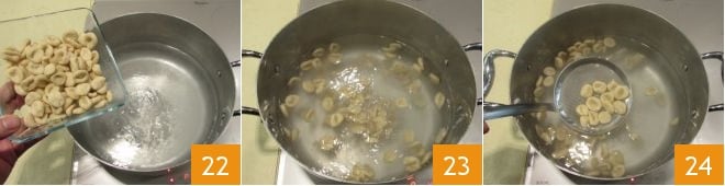 Quand les haricots seront cuits, portez l'eau à ébullition dans une grande casserole, salez à votre goût et immergez les pisarei 22 et cuisez-les quelques minutes, le temps qu'ils remontent à la surface 23; puis égouttez-les avec une écumoire 24