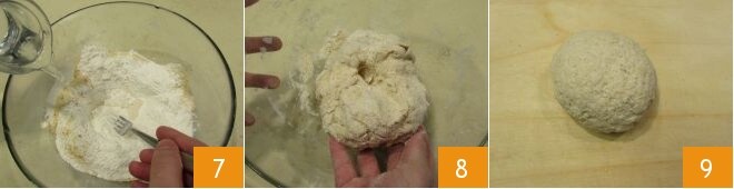 Versez l'eau tiède en filet 7 et pétrissez vigoureusement pour amalgamer les ingrédients 8, formez une pâte compacte 9