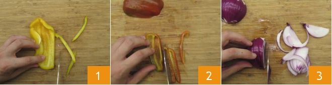Pour réaliser la pita au poulet frit, commencez par laver les poivrons, puis coupez-les en deux, retirez les graines internes et ensuite coupez-les en fines lanières 1 2. Épluchez et émincez également l'oignon rouge 3.