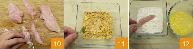 Prenez le poulet et coupez-le en bâtonnets 10. Préparez la panure : dans un bol, versez les corn flakes et la chapelure, parfumez avec l'origan 11 et dans deux autres, versez respectivement les œufs battus et la farine. Maintenant, prenez un morceau de poulet et passez-le d'abord dans la farine 12.