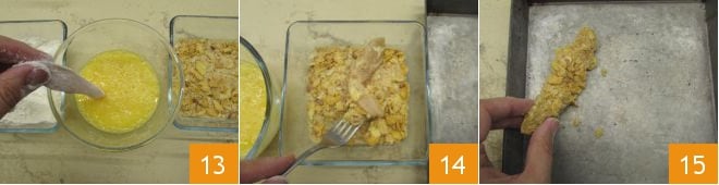 Puis, plongez le poulet dans les œufs battus 13 et enfin passez-le dans les corn flakes 14. Répétez une autre fois le passage des œufs et de la chapelure aux corn flakes, ainsi vous obtiendrez une panure encore plus croustillante. Au fur et à mesure que vous panez les morceaux, déposez-les sur une plaque 15.
