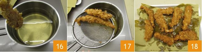 Chauffez l'huile pour la friture et lorsqu'elle atteint 170° (à mesurer avec un thermomètre alimentaire), plongez les morceaux 16. Cuisez pendant environ 3 minutes. Dès que le poulet est doré, égouttez-le avec une écumoire 17 et déposez-le sur un plateau recouvert de papier absorbant pour éliminer l'excès d'huile 18.