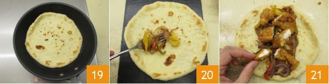Maintenant, chauffez la pita dans une poêle pendant quelques minutes 19. Encore chaude, garnissez-la avec les légumes sautés 20 et le poulet frit coupé en morceaux 21.
