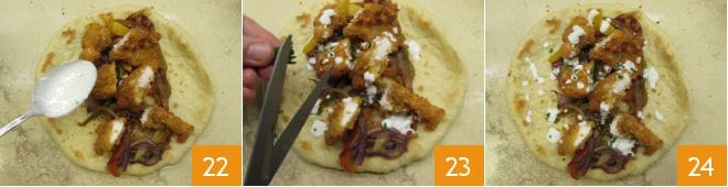 Assaisonnez avec la sauce au yaourt 22 et la ciboulette coupée en rondelles 23. La Pita au poulet frit est prête 24, repliez-la en deux et dégustez-la chaude !