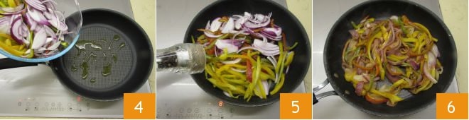 Chauffez une poêle avec 2 cuillères à soupe d'huile d'olive, ajoutez les légumes 4, salez, poivrez 5 et faites-les sauter pendant 10 minutes. Ils doivent être tendres 6.