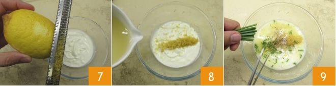 Entre-temps, préparez la sauce : dans un bol, versez le yaourt, aromatisez avec le zeste du citron 7 et son jus 8, enfin parfumez avec la ciboulette coupée en petits morceaux 9.