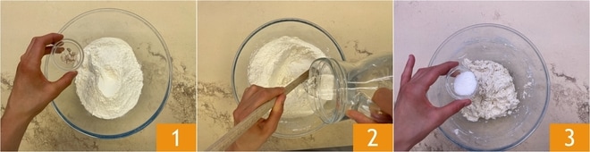 Pour préparer la pizza avec crème de truffe et jambon, commencez par la pâte. Dans un grand bol, mélangez la levure fraîche avec la farine 1. Versez l'eau petit à petit 2 et à ce moment-là, incorporez le sel 3.
