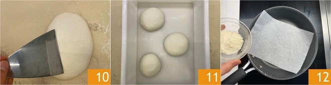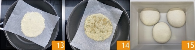 Après ce temps, avec l'aide d'une spatule, divisez la pâte en 6 morceaux d'environ 260 g 10. Laissez lever les pâtons à une température entre 18° et 24°C pendant 8/12 heures dans une boîte pour pâtes 11. Entre-temps, vous pouvez préparer les petites tuiles de Grana Padano. Disposez du papier sulfurisé sur une poêle et versez le Grana au centre 12.