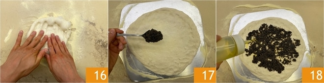 Prenez délicatement chaque morceau de pâte et étalez-le avec un peu de farine 16. Sur la pelle à pizza, étalez le disque de pâte et garnissez-le avec la crème de truffe 17 et un filet d'huile d'olive extra vierge 18.