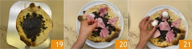 Faites cuire la pizza dans un four préchauffé à 250° (ou à la température maximale disponible) pendant environ 5-7 minutes en mode statique 19. Sortez du four et ajoutez les tranches de jambon 20 et les petites boules de mozzarella de bufflonne 21.