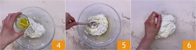 Ajoutez également l'huile d'olive extra vierge 4 et le sucre, puis mélangez d'abord avec une cuillère 5, ensuite commencez à pétrir avec les mains 6.