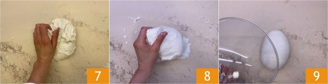 Au début, la pâte sera rustique et collante 7, mais après l'avoir travaillée sur le plan de travail, elle deviendra de plus en plus lisse et homogène 8. Dès que la pâte sera lisse, laissez-la reposer sous un bol ou un torchon pendant environ 30 minutes 9.