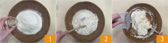 Pour préparer la pizza à la Nerano avec bordure farcie, mélangez dans un bol la farine et la levure sèche 1. Versez l'eau à température ambiante petit à petit en mélangeant avec une cuillère 2 jusqu'à ce que la farine ait absorbé tout le liquide 3.