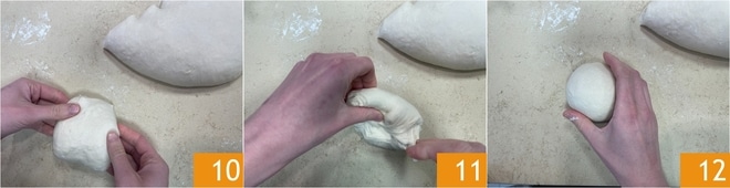 Formez des boules de pâte : étalez légèrement la pâte 10, repliez-la vers le centre 11 et faites rouler 12.