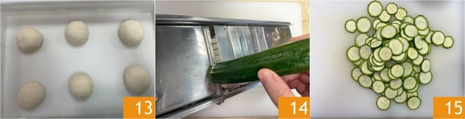 Placez les boules sur un plateau recouvert de papier sulfurisé 13 et laissez lever pendant environ une heure à température ambiante, couvertes de film plastique. Ensuite, transférez le plateau au réfrigérateur pour une nuit (environ 8-10 heures). Préparez les courgettes à la Nerano : lavez et parez les courgettes, puis tranchez-les avec une mandoline 14 pour obtenir des rondelles fines 15.