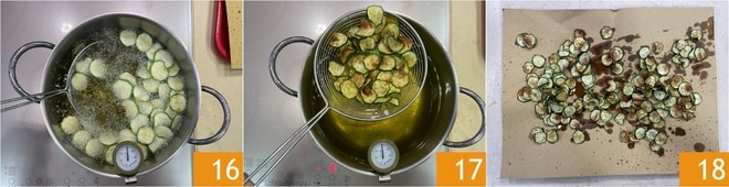 Faites frire les courgettes dans de l'huile végétale à une température d'environ 160°, en petites quantités et pendant peu de temps 16 ; elles doivent juste dorer 17. Égouttez les courgettes frites sur un plateau recouvert de papier absorbant pour éliminer l'excès d'huile 18