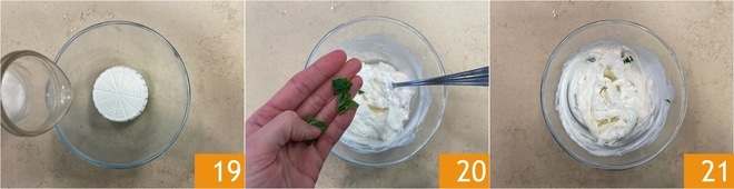 Égouttez bien la ricotta et placez-la dans un bol avec le lait 19. Mélangez et parfumez avec des feuilles de menthe fraîche 20. Réservez cette crème qui servira à farcir la bordure 21.