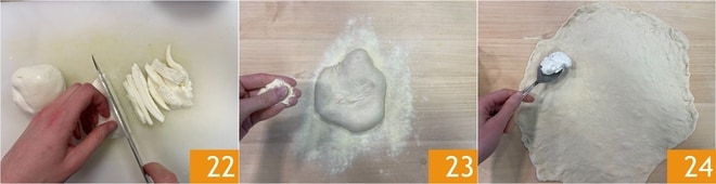 Égouttez bien la mozzarella fior di latte et coupez-la en bâtonnets 22. Une fois le temps de levée écoulé, reprenez les boules de pâte et laissez-les à température ambiante pendant 30 minutes. Ensuite, travaillez-les une par une sur le plan de travail fariné 23. Étalez la pâte à la main pour créer un disque d'environ 30 cm, en veillant à ce que le centre soit plus épais que le bord. Répartissez la crème de ricotta sur le bord 24.