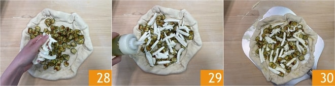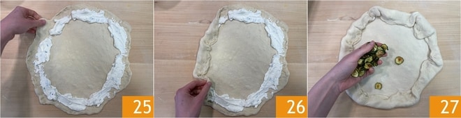 Repliez les bords extérieurs vers l'intérieur 25 pour couvrir la farce et former la bordure tout autour de la circonférence 26. Répartissez les courgettes frites au centre 27.