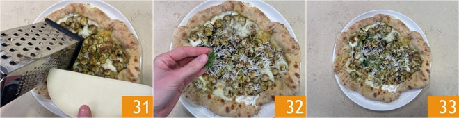 Sortez du four et ajoutez immédiatement le provolone del Monaco râpé 31, puis garnissez de menthe fraîche 32. Procédez de la même manière pour cuire toutes les pizzas. Votre pizza à la Nerano avec bordure farcie est prête à être dégustée 33 !