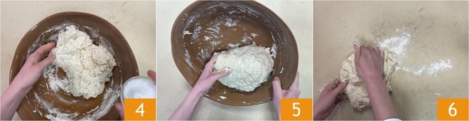 Formez une boule, couvrez-la avec le bol 7 et laissez reposer au moins 5 minutes sur le plan de travail 8. Passé ce temps, utilisez le coupe-pâte pour diviser la pâte en 6 boules d'environ 280 g chacune 9.