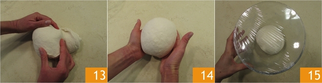 Retournez-la sur elle-même 13, donnez-lui la forme d'une sphère 14. Transférez la pâte ainsi formée dans un bol, couvrez de film plastique 15 et laissez lever. Pour plus de commodité, vous pouvez placer le bol dans le four éteint mais avec la lumière allumée, ainsi l'intérieur atteindra la température de 26-28°C, idéale pour la levée ; sinon, vous pouvez aussi garder le bol dans un endroit chaud. Les temps sont approximatifs car chaque pâte, la température et les conditions météorologiques influencent la levée : en moyenne, la pâte devrait prendre 6 heures pour doubler de volume.