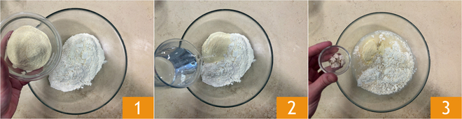 Pour préparer la pizza aux pommes de terre, versez les farines dans un bol 1 avec l'eau 2 et la levure émiettée 3.